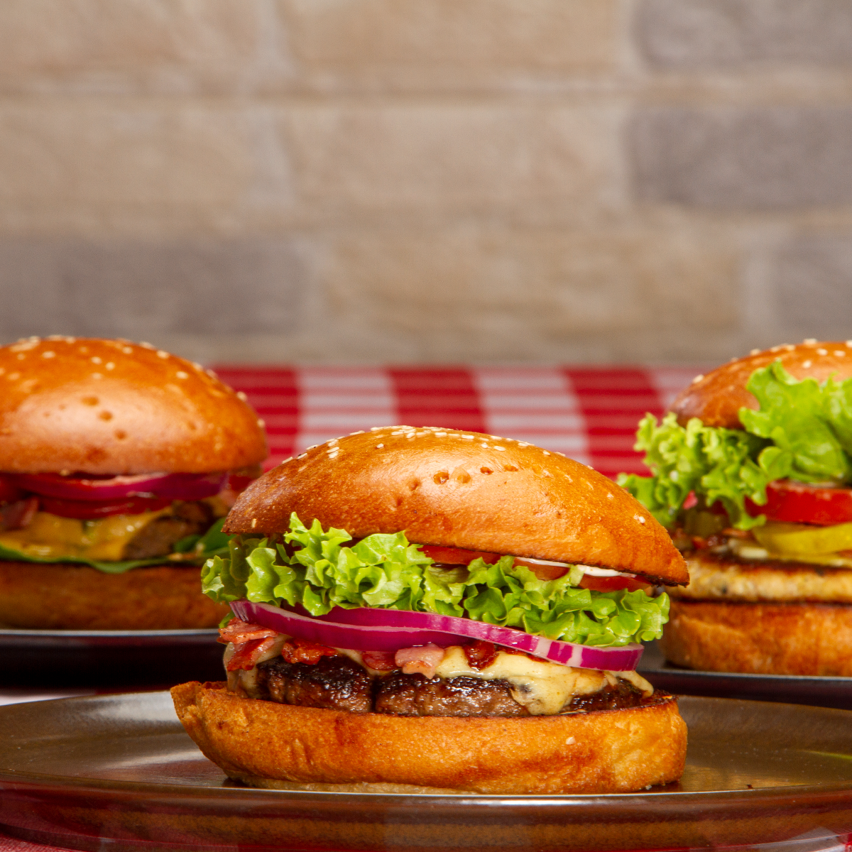 Hamburguesa de pollo, tocineta, cebolla carameliza, pepinillos y vegetales, frescos y queso
