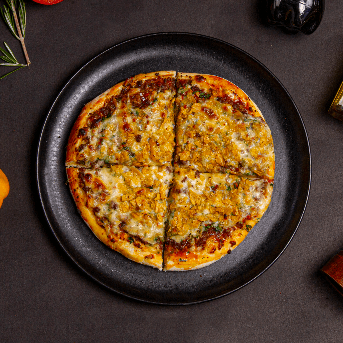 Pizza con pico de gallo, carne molida, chips de maíz picante, jalapeño, salsa napolitana y queso.