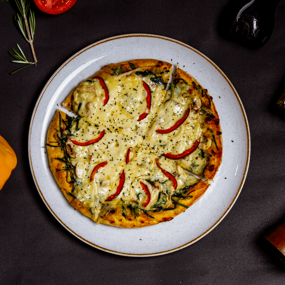 Pizza con espinaca, champiñones , cebolla, tomate, pimentón, salsa napolitana y queso.